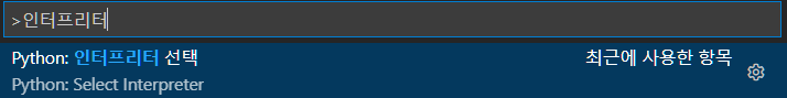 혹은 보기>명령팔레트 (Ctrl+Shift+P) 를 클릭하여 Python 인터프리터 선택 항목을 클릭한다. - 가상환경 폴더에 있는 인터프리터 경로로 변경한다. 보통 추천이라고 써있다.